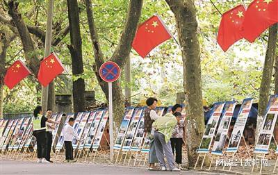 10月6日,游客在170厂梧桐大道上参观“三线记忆·图片巡展”。石照昌 摄