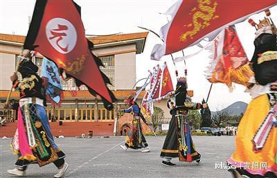 在热闹的锣鼓声中,黔中地戏队接连献上《黔地遗风》《三英战吕布》《黔中有戏》三出剧目,表演兼具高难度与强观赏性。演员们额顶木雕面具,身着战裙,背插靠旗,手持刀枪,在紧密的鼓点中腾挪击刺、步伐雄健,将观众瞬间带入金戈铁马与英雄豪情之中。